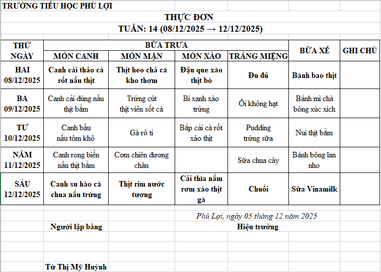 Thực đơn tuần: 14 (08/12/2025 → 12/12/2025)